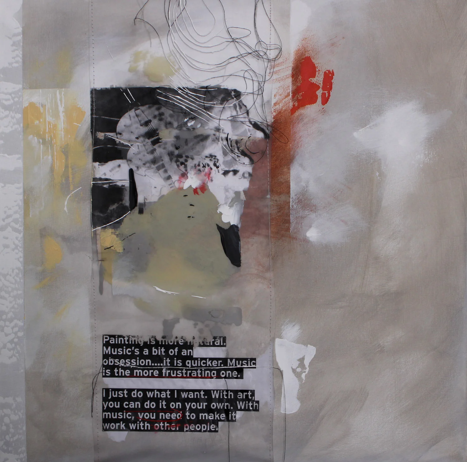 50 x 50 cm, acrylic paint on canvas, print and photocopies acetate sheet, thread.